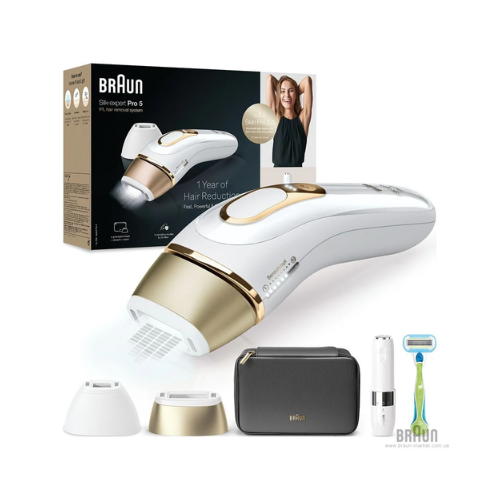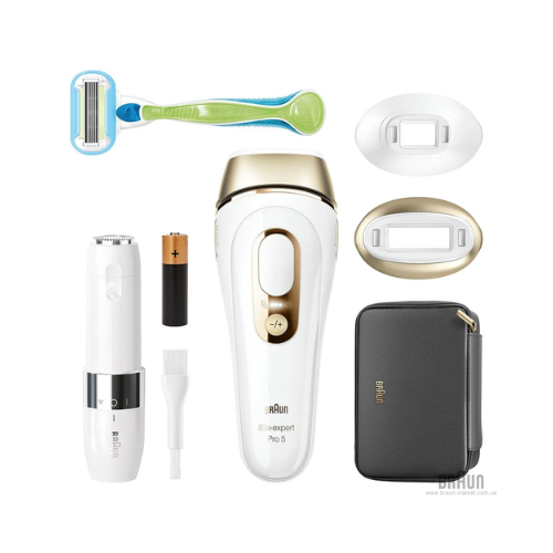 Series: Silk expert Pro 5. System: IPL (photoepilation). Compatible skin types: 1-5. Area of effect: 3 sq. cm. Service life: 400,000 flashes. 10 intensity levels. SensoAdapt sensor. GentleMode function. Sliding mode. Flash frequency: 1-2 sec. Power supply: mains. Cosmetic bag, precision photoepilation head, mini razor and Venus Extra Smooth razor included.