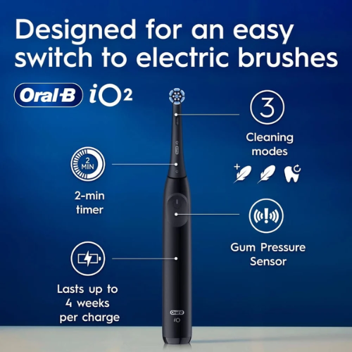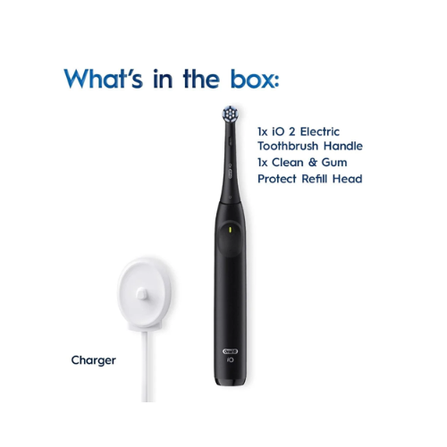 The Oral-B iO Series 2 combines powerful, but gentle micro vibrations with Oral-B's dentist inspired round brush head to deliver 100% cleaner teeth versus a regular manual toothbrush. So advanced yet so simple, that you will be able to achieve that dentist clean feeling in just 1 touch of a button.