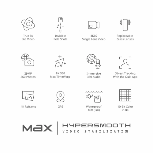 - Video Modes: 360: Video, POV, Selfie, LoopingSingle-Lens: Video
