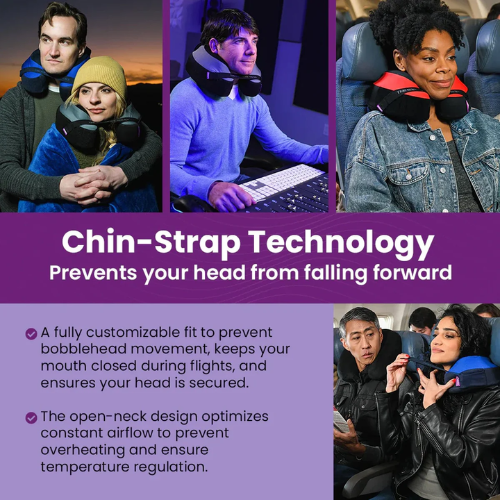 - Chinstrap Technology - Customizable, secure fit, open-neck design for heat regulation, and prevents "bobblehead" movement, ensuring comfort and stability during travel
